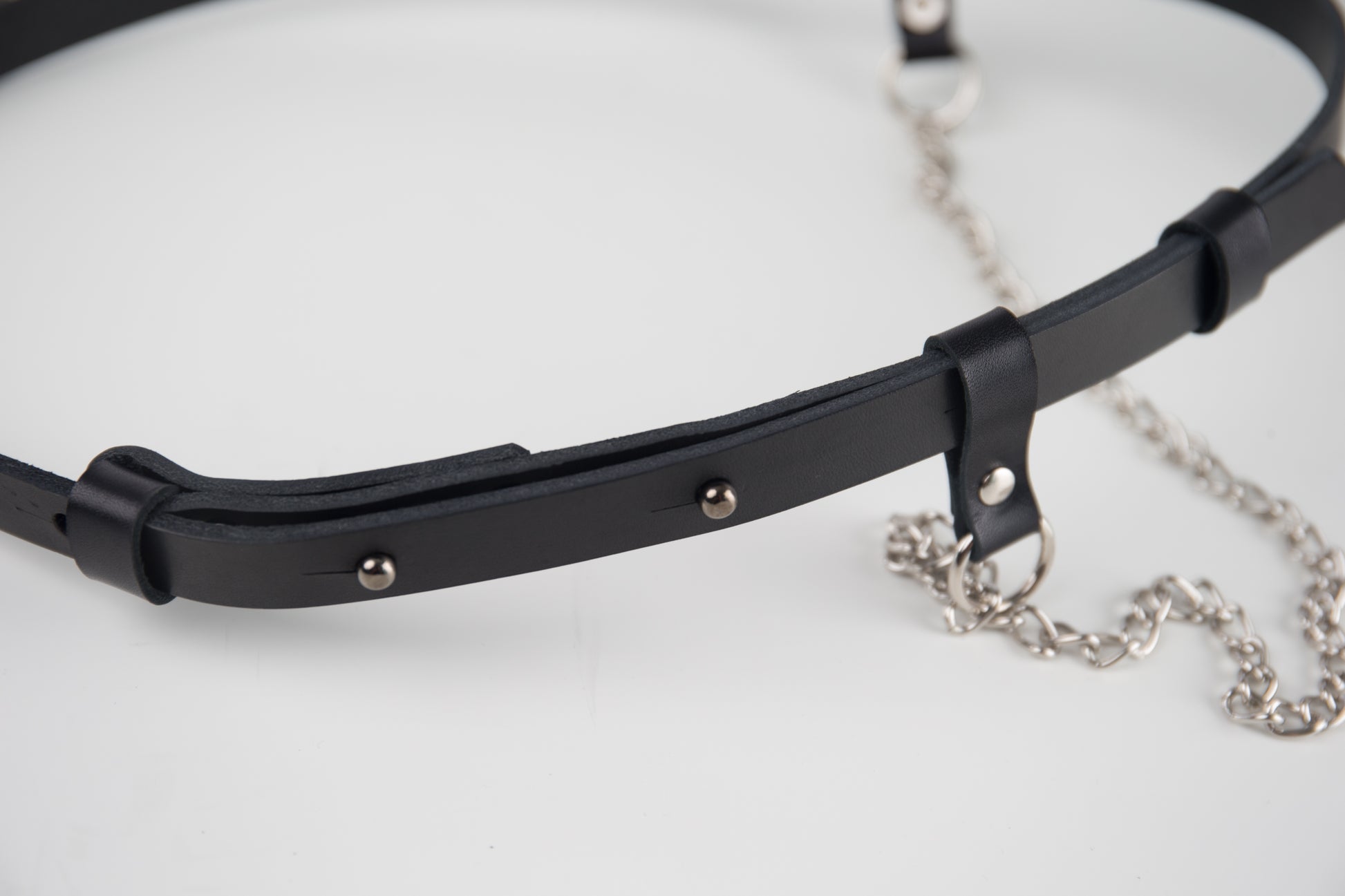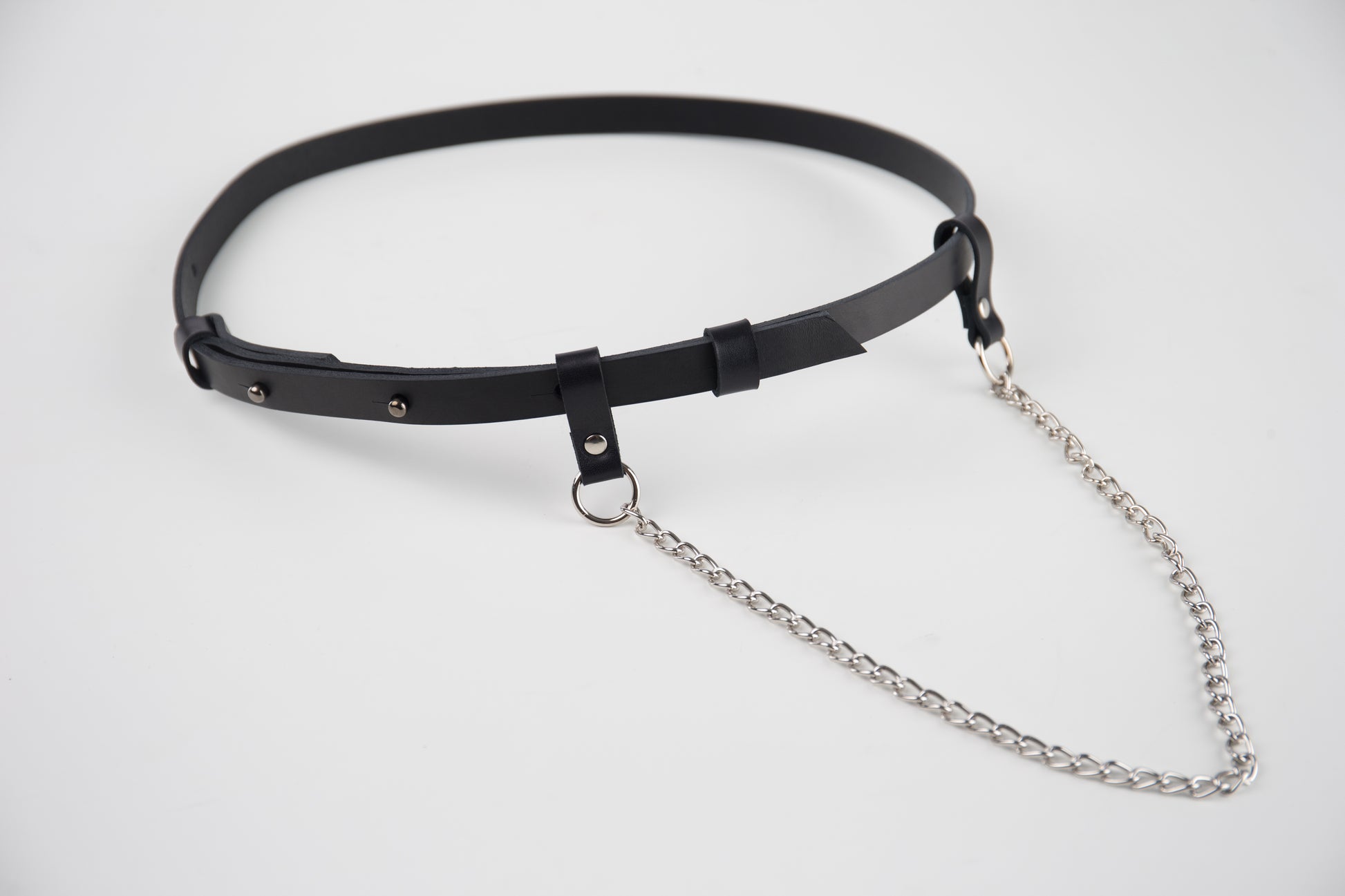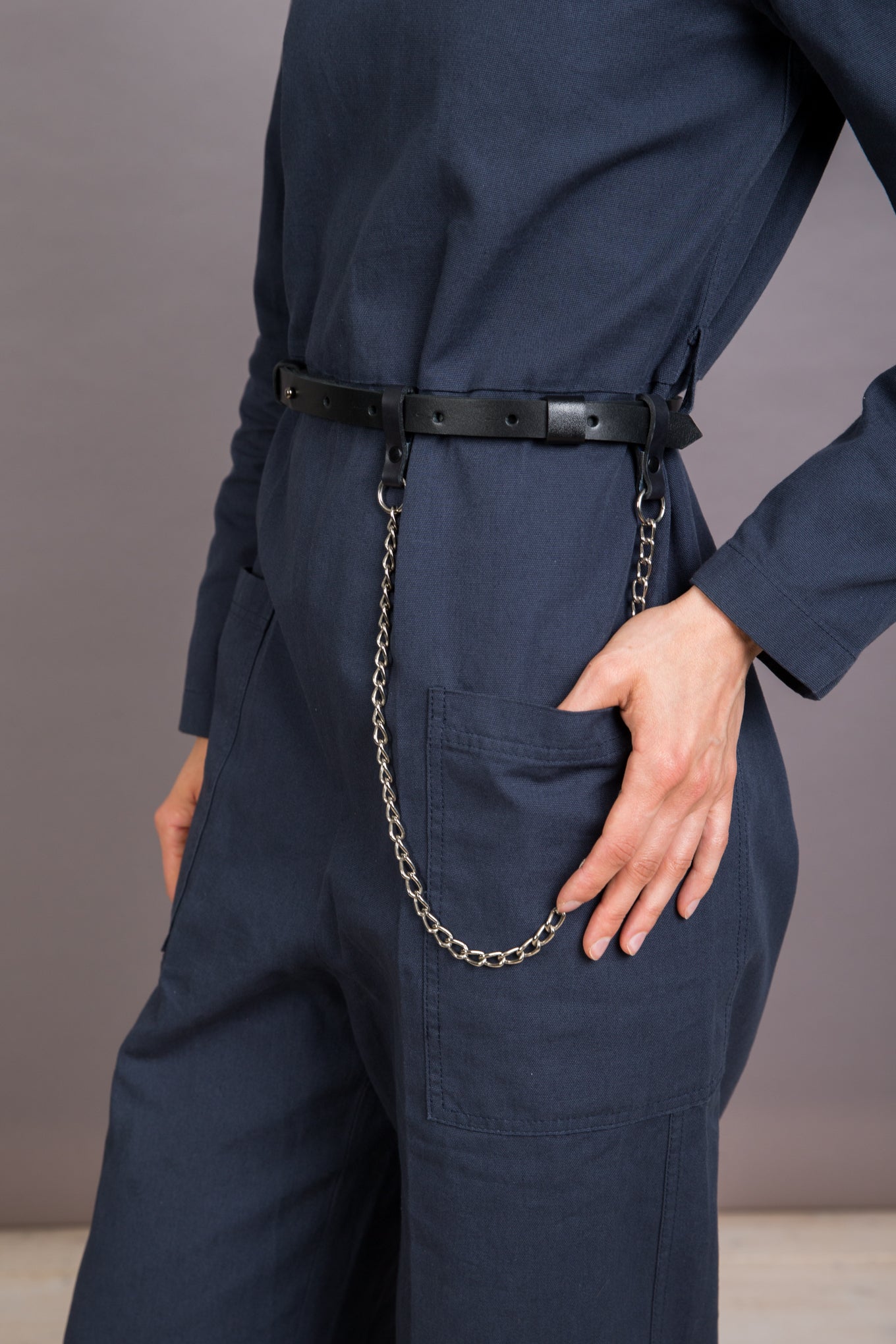 A minimal black leather belt featuring a metal chain for a bold, edgy look. Designed to sit at the high waist and secured with screw-back rivets, it adds character to any outfit.