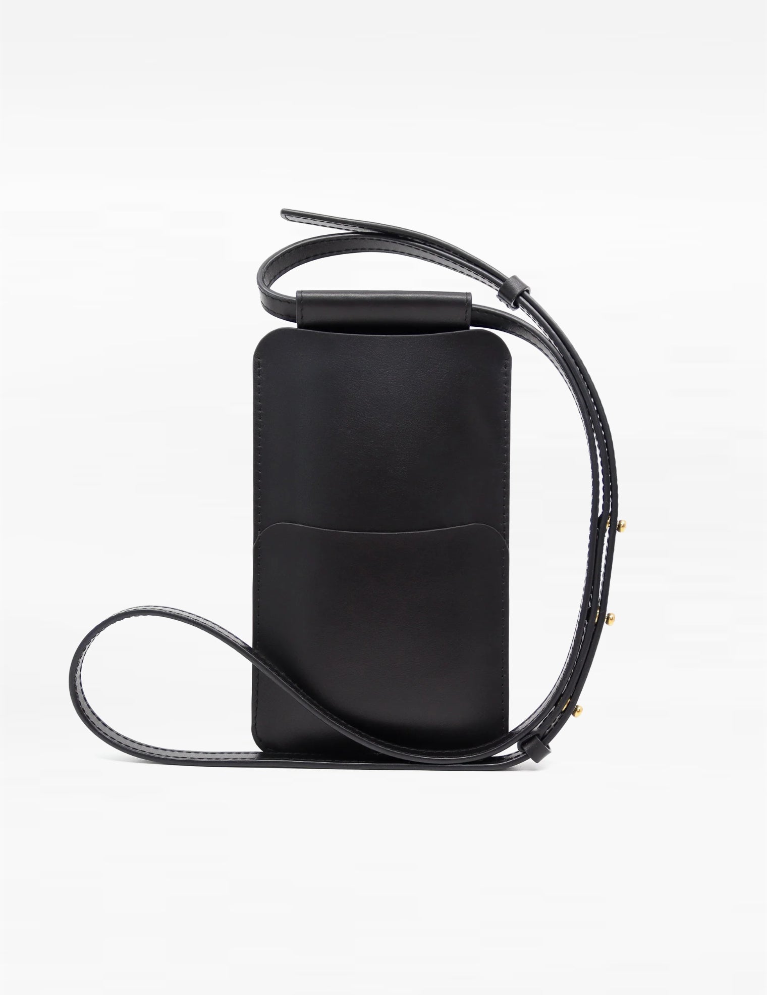 This compact crossbody bag keeps your smartphone and up to eight cards secure and easily accessible – perfect for days when you only need the essentials. The back features convenient card slots, while the front pocket offers space for receipts or notes. The long strap is adjustable via three Sam Browne studs, available in gold or silver finish.